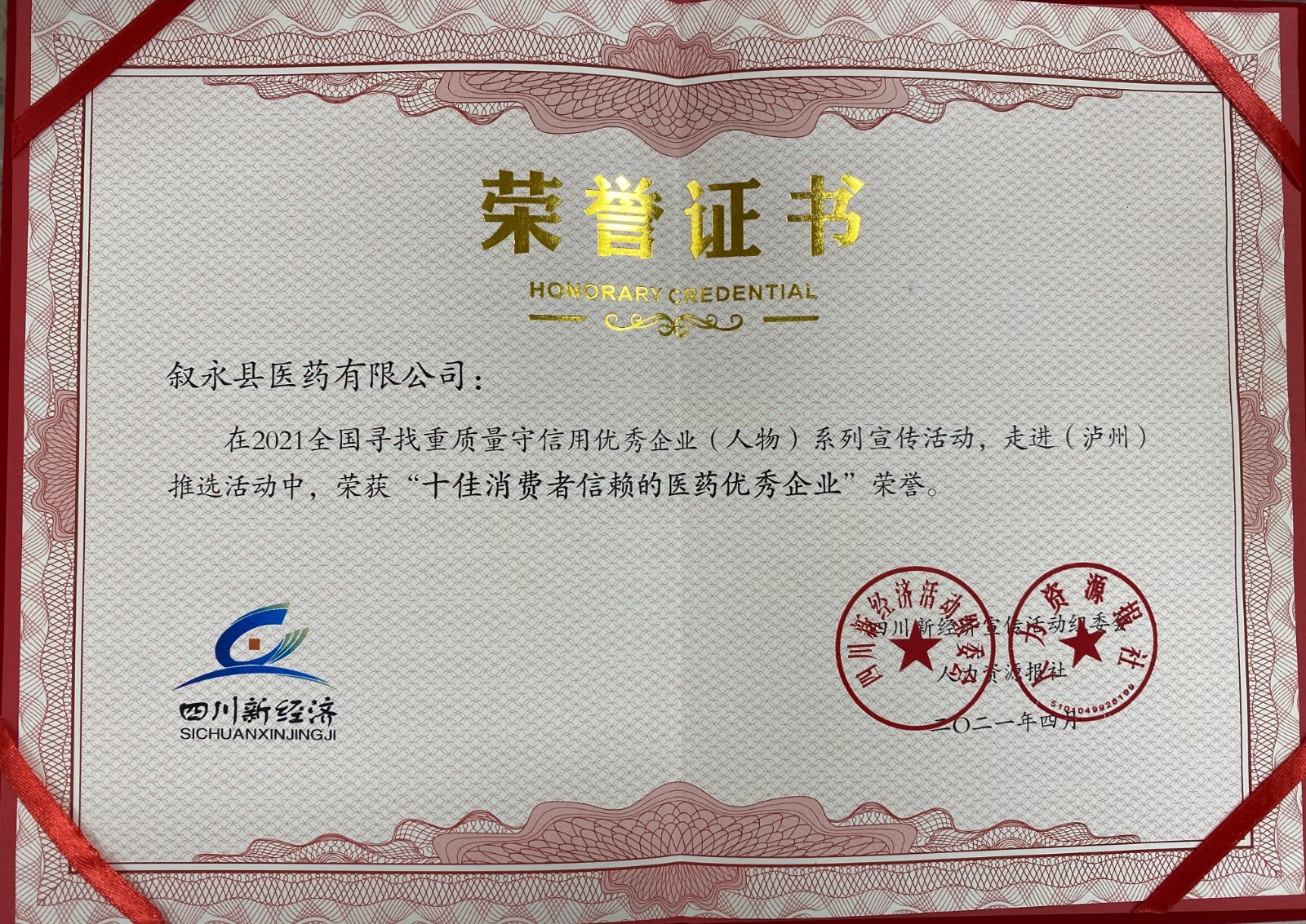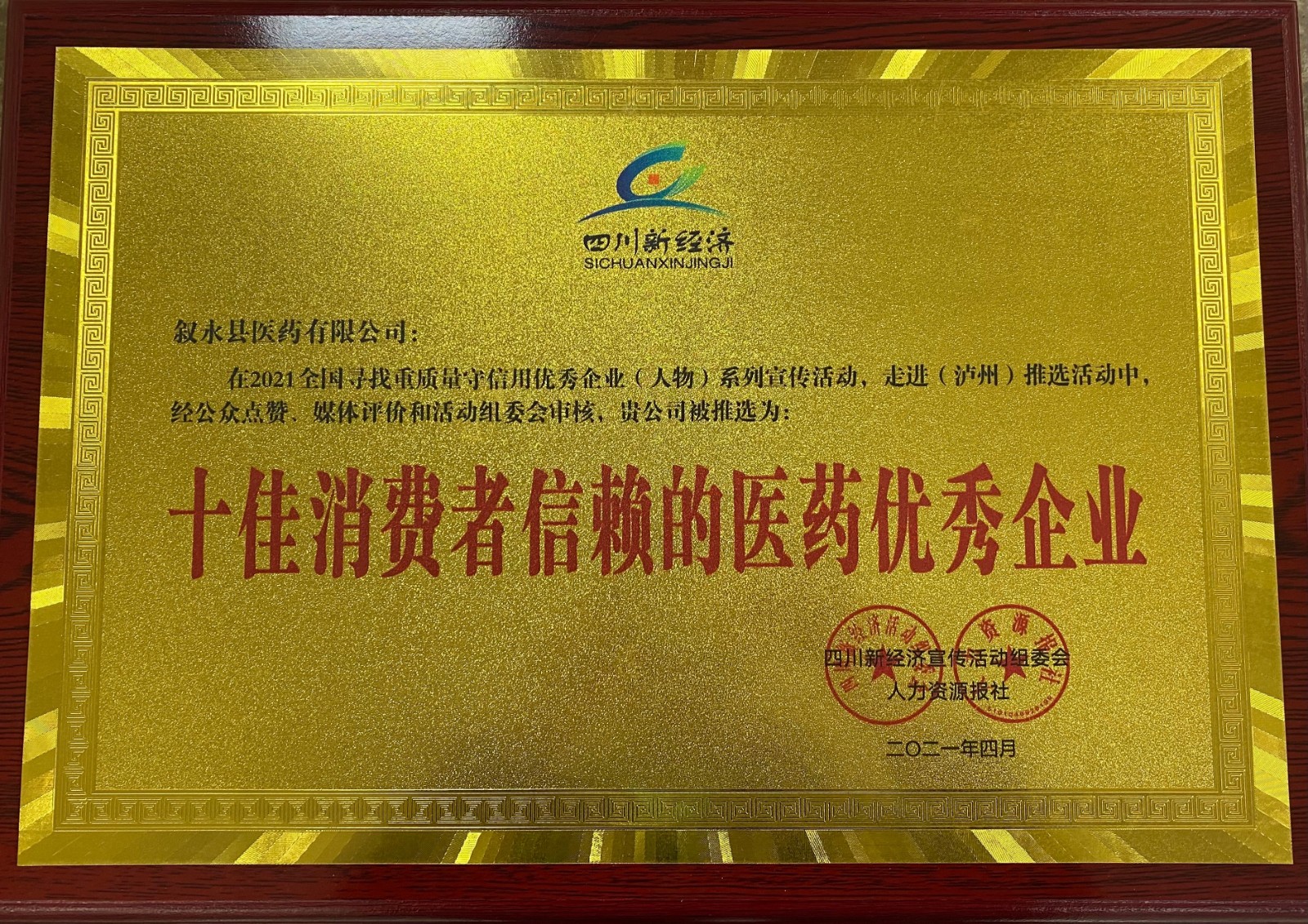 敘永縣醫藥有限公司在四川日報報業集團人力資源報、四川新經濟宣傳活動組委會尋找2021年全國重質量守信用優秀企業(人物)系列宣傳活動,走進(瀘州)推選活動中,經公眾點贊、媒體評價和活動組委會審核,被推選為:“十佳消費者信賴的醫藥優秀企業”。